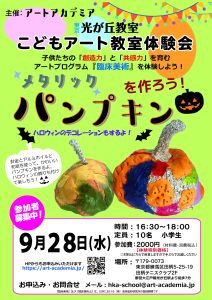 9月28日(水)光が丘教室にてアートワークショップ「メタリックパンプキンを作ろう!」を開催します。 カボチャをじっくり観察して、キラキラしたかわいいパンプキンを作ろう! ハロウィンの飾りつけもして、秋にピッタリの楽しい工 […]