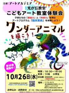 10月26日(水)光が丘教室にてアートワークショップ「ワンダーアニマルを描こう!」を開催します。 墨とオイルパステルを使って自由に想像した面白い空想の動物を描くよ! 墨とオイルパステルの練習もするので誰でも楽しく参加でき […]