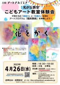 4月26日(水)光が丘教室にてアートワークショップ「花をかく」を開催します。 水彩絵の具を使い「にじみ絵」という方法で色とりどりの春のお花を描いていきます。 お花の色や形、香りの印象も大切にして思い思いの絵の具をにじませ […]