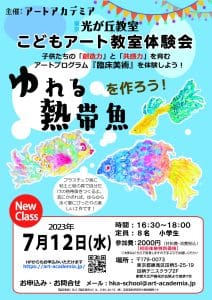 7月のこどもアート教室体験会は『ゆれる熱帯魚をつくろう!』です。 プラスチック板に、粘土と絵具を使いカラフルでユニークな自分だけの熱帯魚を作ります。 窓に飾れば、ゆらゆらと揺れる夏にピッタリの楽しい工作です!   […]