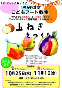 光が丘こどもアート教室10・11月レッスンは『玉ねぎをつくる』です! 自分で選んだ玉ねぎを観察して、粘土で玉ねぎのオブジェをつくります。 粘土の上に薄い色とりどりの和紙を重ねて貼ることで、個性豊かな作品が出来ます! ※現 […]