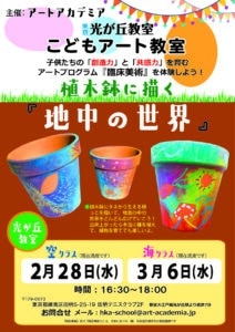 光が丘こどもアート教室2月「空クラス」・3月「海クラス」のレッスンは『植木鉢に描く、地中の世界』です! 植木鉢にタネからのびる根っこを描いて、そこから地面の中の世界をどんどん広げていこう! 植木鉢の上でオイルパステルをベ […]